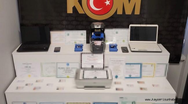 Kayseri İl Emniyet Müdürlüğü Kaçakçılık ve Organize Suçlarla Mücadele (KOM) Şube Müdürlüğü Mali Suçlar Büro Amirliği ekipleri tarafından yapılan çalışmalarda, sosyal medya üzerinden para karşılığı kimlik, sürücü belgesi ve diploma gibi belgelerin sahtesini yaparak çevre illere ve yurtdışına gönderim yapan şahıslar tespit edildi. Harekete geçen ekipler Kayseri ve Aksaray'da 3 farklı adrese eş zamanlı operasyon düzenledi. Düzenlenen operasyonda 19 adet sahte diploma, 8 adet sahte kimlik belgesi, 15 adet sahte sürücü belgesi, 1 adet ikamet izin belgesi, 7 adet muhtelif kart, 3 adet sim kartlı kartuş, 2 adet çipli boş kart, 2 adet laptop, 1 adet kimlik basımında kullanılan yazıcı, 1 adet renkli yazıcı ve 1 adet USB bulunurken, 2 kişi de yakalandı.