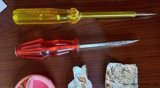 Kayseri İl Emniyet Müdürlüğü Asayiş Şube Müdürlüğü'ne bağlı Güven Timleri Büro Amirliği ekipleri tarafından Talas ilçesine bağlı Osmanlı Sokağı'nda yapılan çalışmalarda durumundan şüphelenilen E.T., durdurularak üst aranması yapıldı. Yapılan aramada E.T.'nin üzerinden 2 adet tornavida,1 adet İngiliz anahtarı,1 adet sim kart ve şeker kutusu bulundu. Şeker kutusunu kontrol eden ekipler, içerisinde alüminyum folyoya sarılmış 8.24 gram uyuşturucu madde olduğunu tespit etti.