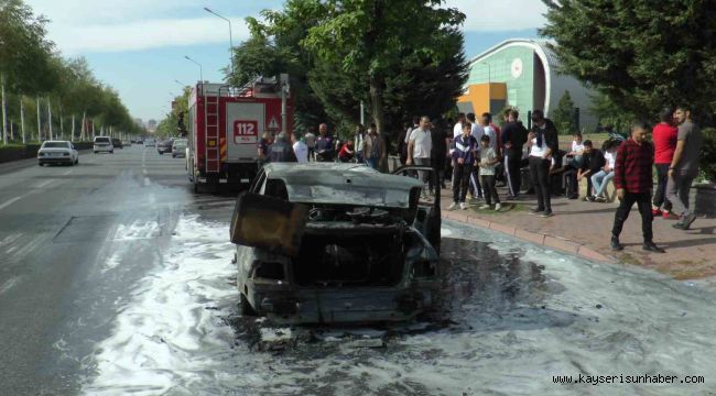 Kayseri'nin Melikgazi ilçesinde seyir halindeyken alev alan otomobil kullanılamaz hale gelirken, olay yerinde bulunan vatandaşlar yanan araçtan görüntü alabilmek için birbiriyle yarıştı.