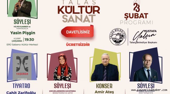Şubat ayının en önemli programlarından birisi de Türk Sanat Müziğinin usta bestecisi ve yorumcusu Amir Ateş konseri olacak. Amir Ateş ve beraberindeki grubun vereceği konserde Kayseri şarkıları seslendirilecek. 24 Şubat Cuma akşamı saat 19.30'da başlayacak olan program, Erciyes Üniversitesi Kültür Merkezi'nde gerçekleştirilecek. Şubat ayı Talas Kültür Sanat etkinliklerinin son programı ise gazeteci yazar Yusuf Kaplan'ın konuşmacı olarak katılacağı '28 Şubat Sürecinden 2023 Türkiyesi'ne' konulu söyleşi olacak. 27 Şubat Pazartesi günü saat 19.30'da başlayacak söyleşi Kayseri Üniversitesi 15 Temmuz Yerleşkesi Konferans Salonu'nda düzenlenecek.