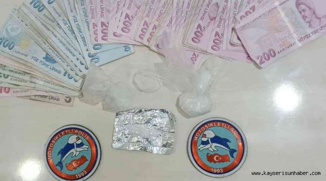 Kayseri İl Emniyet Müdürlüğü Asayiş Şube Müdürlüğü'ne bağlı Motosikletli Polis Timleri Büro Amirliği ekipleri tarafından Kocasinan ilçesinde yapılan çalışmalarda, durumundan şüphelenilen E.A. durdurularak kontrolü yapıldı. Şahsın yapılan üst aramasında 3 parça halinde uyuşturucu madde ve 9 bin 730 TL para bulundu.