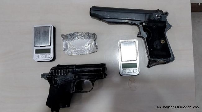 Kayseri İl Emniyet Müdürlüğü Asayiş Şube Müdürlüğü Güven Timleri Büro Amirliği ekipleri Hürriyet Mahallesi Evliya Çelebi Caddesi üzerinde bekleme yapan bir araçtan süphelendi. Ekipler tarafından araç içerisinde bulunan şahıslarda yapılan aramalarda 2 adet tabanca, 2 adet hassas terazi ve 0,97 gram uyuşturucu madde bulundu.