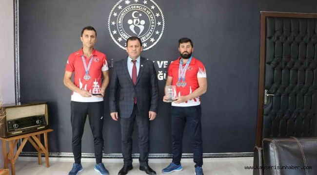 Dünya Taekwondo Başkanlık Turnuvasından 3 bronz madalya ile dönen Kayserili Taekwondo sporcuları Fatih Gazcı ile Hasan Gülnar, Gençlik ve Spor İl Müdürü Ali İhsan Kabakcı'yı ziyaret etti.
