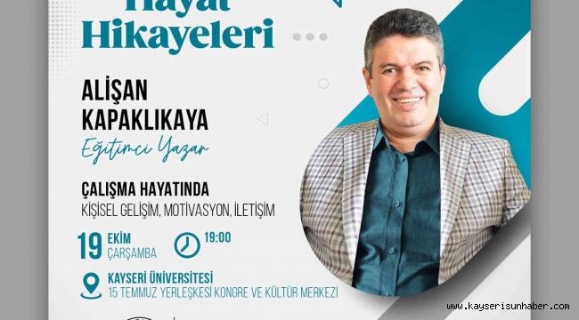 Eğitimci yazar Alişan Kapaklıkaya, Talas Belediyesi tarafından düzenlenen programla "Çalışma Hayatında Kişisel Gelişim, Motivasyon, İletişim" konulu bir söyleşi gerçekleştirecek.