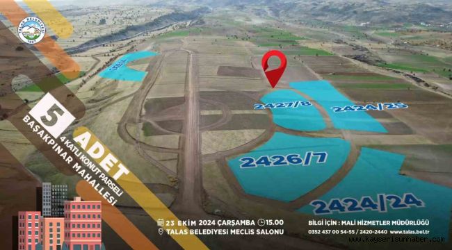 Talas Belediyesi; kaçırılmayacak yatırım fırsatları sunmaya devam ediyor. Düzenlenecek ihalelerle Başakpınar Mahallesi'nde 5 parça 4 katlı konut arsası, Reşadiye'de 2 villa parseli...