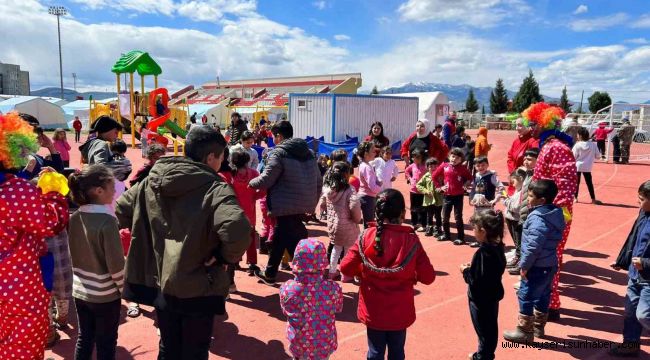 Deprem bölgesindeki etkinlikte, palyaço gösterileri de yapılarak çocuklara hediye dağıtıldı.