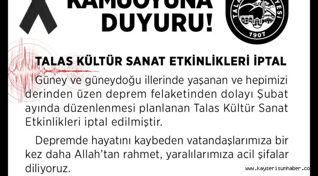 Talas Kültür Sanat etkinlikleri, Kahramanmaraş'ın Pazarcık ilçesinde meydana gelen 7,7 büyüklüğündeki şiddetli depremin ardından iptal edildi.