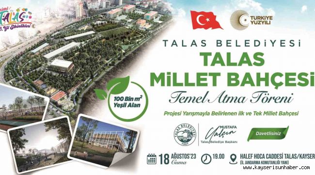 Projesi yarışmayla belirlenerek yaptırılacak ilk ve tek millet bahçesi olan Talas Millet Bahçesi'nin temeli 18 Ağustos Cuma günü saat 19.00'da düzenlenecek törenle atılacak.