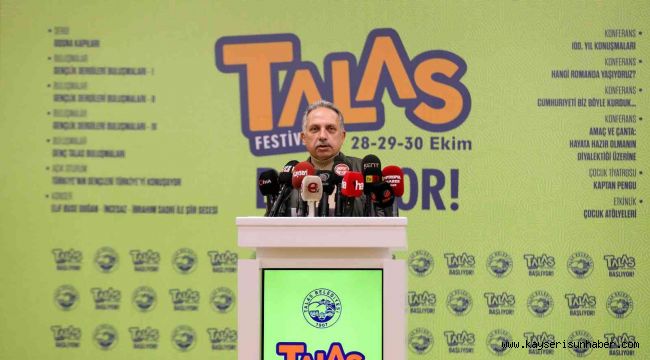 Talas Belediyesi tarafından düzenlenen Talas Festivaline sayılı günler kalırken, Talas Belediye Başkanı Mustafa Yalçın, 28-29-30 Ekim tarihlerinde gerçekleştirilecek festivalle ilgili olarak, "Konserlerden gençlik buluşmalarına, açık oturum ve konferanslardan çocuk atölyelerine dolu dolu etkinliklerin yer alacağı Talas Festivaline bütün hemşehrilerimizi bekliyoruz" dedi.