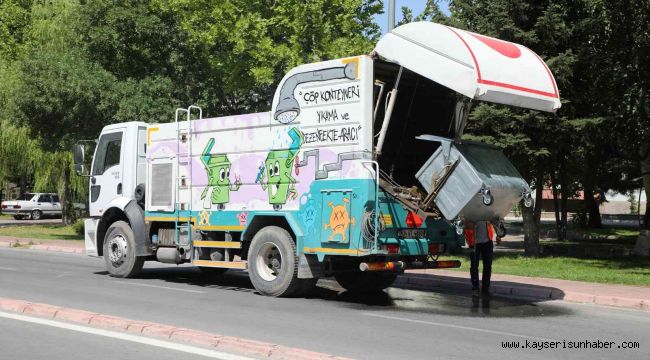 Talas Belediyesi, çöp konteynerlerinin sıcak yaz günlerinde koku yapmaması için anında yıkama işlemi gerçekleştiriyor.