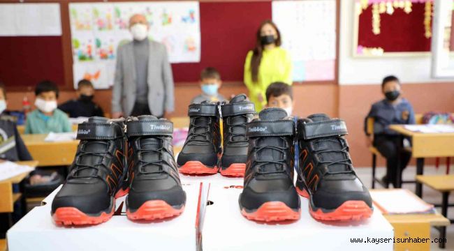 Talas Belediye Başkanı Mustafa Yalçın, Sakaltutan İlköğretim Okulu öğrencilerine hayırsever desteğiyle kışlık bot hediye etti.