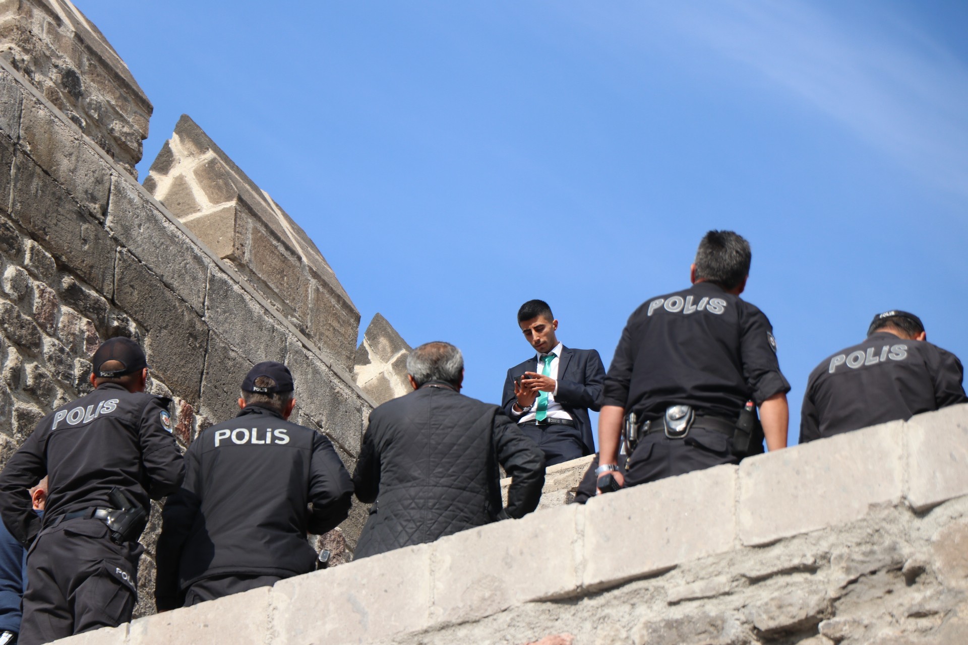 Edinilen bilgiye göre, bunalıma girdiği iddia edilen 1 kişi, tarihi kalenin surlarına çıkarak intihar etmek istedi. Çevredekilerin ihbarı üzerine olay yerine polis, itfaiye ve sağlık ekipleri sevk edildi. Polis ekipleri çevrede güvenlik önlemi alırken, itfaiye ekipleri de, şahsın bulunduğu yerin altına branda açtı. Polis ekipleri de, surlara çıkan şahsı ikna etmek için çaba harcadı. Bir süre sonra ikna olan şahıs, polis ekipleri tarafından surlardan indirilerek polis merkezine götürüldü.