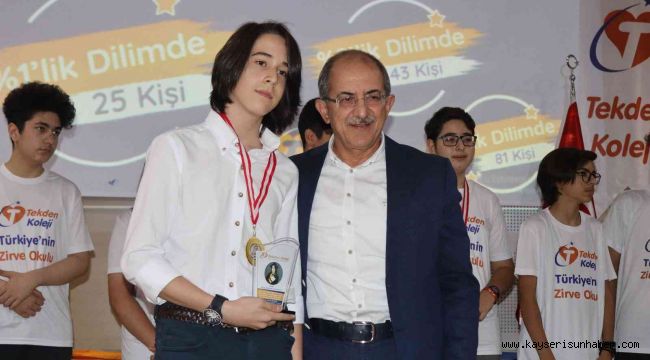 Başarılı öğrencilere, Tekden Ortaokulu'nda düzenlenen program ile plaket ve madalya verildi. Burada konuşan Tekden Grup Yönetim Kurulu Başkanı Kemal Tekden, başarılı öğrencileri ve ailelerini tebrik etti. Tekden, "Tekden Eğitim Kurumları'nda sınava giren öğrencilerimizden yüzde 1'lik dilimde 25 öğrenci, yüzde 2'lik dilimde 43, yüzde 5'lik dilimde toplam 81 öğrenci ve sınavla öğrenci alan okullara girebilecek 157 öğrencimiz mevcuttur. Bütün öğrencilerimizi tebrik ve takdir ediyorum. Emeği geçen eğitim liderlerimize ve bizlere güvenen ailelerimize teşekkür ediyorum. 'İyi bir lise, iyi bir üniversite demektir' anlayışı ile Kayseri'miz bu anlamda çok şanslı. Çünkü fiziki yapısı ve donanımı ile üniversite havasında Özel Tekden Fen ve Anadolu Lisemizde ülkemizin ve Kayseri'nin en seçkin, en güçlü eğitim kadrosu ile siz değerli gençlerimizi buluşturuyoruz. Öğrencilerimizin akademik çalışmalarını bütünüyle planlayan okulumuzun LGS çalışmalarını eksiksiz bir şekilde yapması sebebiyle öğrencilerimiz dershane ihtiyacı duymamaktadır. Tekden Koleji, akademik başarılarının yanında sosyal ve sportif alanlarda ortaya koyduğu başarılı ve etkili çalışmalarıyla öğrencilerini geleceğe hazırlamanın mutluluğunu yaşamaktadır" ifadelerini kullandı.