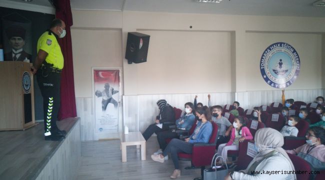 Tomarza Yavuzselim İlköğretim Okulu 4. sınıf öğrencilerine yönelik Tomarza İlçe Emniyet Amirliği Trafik Büro Amiri Tahsin Cerit tarafından Tomarza Halk Eğitim Merkezi Salonu'nda trafik kuralları ve tedbirleri hakkında bilgiler verdi. Eğitimde öğrencilere; trafik kuralları, işaret levhalarının tanıtımı yaya geçidi ve servis araçlarının kullanımı konularında bilgilendirmede bulunuldu. Ayrıca Covid-19 virüsüne karşı alınacak tedbirler kapsamında, sosyal mesafenin korunması, maske kullanımı ve hijyen ile sokağa çıkma kısıtlamaları hakkında da bilgi paylaşımında bulunuldu.