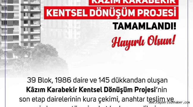 48 hak sahibine son anahtar teslimi yapılacağını hatırlatan Melikgazi Belediye Başkanı Dr. Mustafa Palancıoğlu, "Türkiye'nin en büyük kentsel dönüşüm projelerinden biri olan 39 blok 1986 daire ve 145 dükkandan oluşan Kazım Karabekir Mahallesi Kentsel Dönüşüm Projesi son etap dairelerimizin kura çekimi ve proje kapanış törenini gerçekleştireceğiz. Melikgazi Belediyemiz kentsel dönüşüm konusunda sadece Kayseri'de değil Türkiye'de de en önemli işlevi yapan belediyelerden bir tanesi. Kazım Karabekir Mahallemizde 19 Kasım Cuma günü saat 15.30'da yapılacak olan anahtar teslim programında dairelerimiz sahipleriyle buluşacak. Modern bir şehir anlayışıyla hareket ederek gerçekleştirdiğimiz kentsel dönüşümlerde, Kazım Karabekir'de bulunan 48 anahtarı 48 ailemize teslim etmenin mutluluğunu yaşayacağız. Tüm sosyal donatıları ile güzel bir ortam hazırladık. Yolları, çevre düzenlemesi, parkları, otoparkı, okulu, sağlık merkezi, sosyal donatıları ile güzel bir mahalle ortaya çıktı. Hak sahibi olan vatandaşlarımıza evlerinin hayırlı olmasını diler ağız tadıyla oturmalarını temenni ederim. Hayırlı olmasını dilerim" dedi.