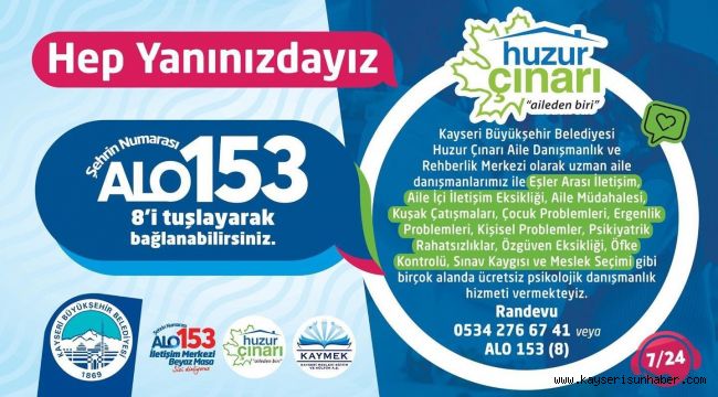 Kayseri Büyükşehir Belediyesi bünyesinde faaliyet gösteren, eğitim ve kursları ile binlerce vatandaşa hizmet veren Kayseri Mesleki Eğitim ve Kültür A.Ş.(KAYMEK) Huzur Çınarı Aile Danışmanlık ve Rehberlik Merkezi, yeni bir projeyi daha hayata geçirdi. Başkan Dr. Memduh Büyükkılıç'ın 'insanı yaşat ki devlet yaşasın' felsefesiyle hizmetlerini sürdüren Büyükşehir Belediyesi, Huzur Çınarı Aile Danışmanlık ve Rehberlik Merkezi ile Alo 153 İletişim Merkezi işbirliğinde psikolojik soruna, sunacağı ücretsiz psikolojik destek sağlıyor. Psikolojik danışmanlık hizmetinden yararlanmak isteyen vatandaşlar, Şehrin numarası Alo 153 Çağrı Merkezi'ni arayıp, 8 (Sekiz) menüsünü tuşlayabilecek. Vatandaşlar, telefonun ucunda kendisini bekleyen Huzur Çınarı Aile Danışmanlık ve Rehberlik Merkezi'nin uzman aile danışmanlarından ücretsiz psikolojik danışmanlık hizmetinden faydalanacak.