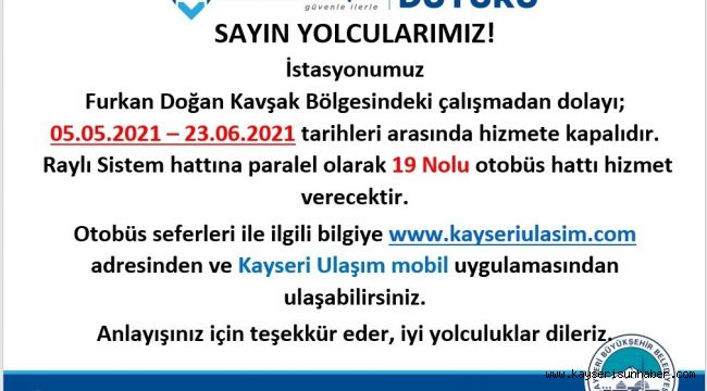 "Furkan Doğan Kavşak Bölgesi'ndeki çalışmadan dolayı, Raylı Sistem T2 Talas Hattı (C. Meydanı-Cemilbaba) 5 Mayıs ile 23 Haziran 2021 tarihleri arasında siz değerli yolcularımıza hizmet veremeyecektir. Bu süre zarfında bu bölgede mağduriyet yaşanmaması için raylı sistem hattına paralel olarak 19 nolu otobüs hattı hizmet verecektir. Anlayışınız için teşekkür eder, iyi yolculuklar dileriz."