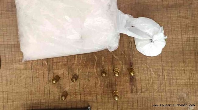 Edinilen bilgiye göre, Kayseri İl Emniyet Müdürlüğü Asayiş Şube Müdürlüğü'ne bağlı Motosikletli Polis Timleri Büro Amirliği ekipleri, Melikgazi ilçesine bağlı Kazım Karabekir Mahallesi'nde uygulama yaptı. Toros Geçidi üzerinde şüphe üzerine E.D.'nin (41) kullandığı 38 AEV 221 plakalı aracı durduran ekipler, arama yaptı. Şahsın üzerinde ve araçta yapılan aramada, kilitli şeffaf poşet içerisinde 200 gram metamfetamin, şeffaf poşet içerisinde 57.60 gram metamfetamin, küçük poşet içerisinde 11.45 gram metamfetamin, alüminyum folyoya sarılı vaziyette 0.85 gram metamfetamin, ayrıca marka ve seri numarası okunamayan 1 adet 7.65 milimetre çapında ruhsatsız tabanca ile 7 adet dolu fişek ele geçirildi.