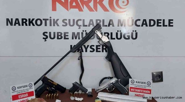 Kayseri İl Emniyet Müdürlüğü Narkotik Suçlarla Mücadele Şube Müdürlüğü ekipleri tarafından uyuşturucu madde kullanan ve uyuşturucu madde ticareti yapan şahısları yönelik il genelinde operasyon düzenledi. 11 adrese düzenlenen eş zamanlı operasyona 33 ekip halinde toplam 115 polis katıldı. Adreslere yapılan operasyonlarda 7 parça halinde farklı miktarlarda uyuşturucu madde, 3 adet ruhsatsız tabanca, 1 adet ruhsatsız tüfek, 15 adet fişek ve 1 adet de uyuşturucu paketlemek için kullanılan folyo ele geçirildi.