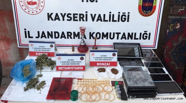 Kayseri'de jandarma ekiplerinin yaptığı operasyonda, bir uyuşturucu zanlısının evinde 14 adet altın bilezik, beştaş yüzük, 34 adet çeyrek altın 8 adet cep telefonu ve 3 adet tablet ele geçirildi.
