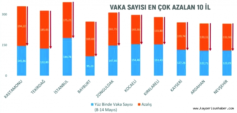 Şehrimize hiç yakışmayan vaka sayılarından sonra şehir olarak uygulamaya konulan tedbirler ve alınan önlemlerle vaka sayımızı yarı yarıya düşürmeyi başardık. Bu düşük ile birlikte ilk 10 şehir arasında yer alan Kayseri’de bu rakamların haftaya 100’ün altına düşmesi beklenirken, Valisinden, belediye başkanına, sağlık il müdüründen esnafa kadar herkes bu düşüşteki payın haklı gururunu yaşıyor. Kayseri ile birlikte vaka sayısı en çok azalan iller, Kastamonu, Tekirdağ, İstanbul, Bayburt, Zonguldak, Kocaeli, Kırklareli, Ardahan ve Nevşehir oldu. Yayımlanan haritaya göre her 100 bin kişide en az Kovid-19 vakası, Şırnak, Adana, Hatay, Osmaniye ve Kahramanmaraş'ta görüldü.