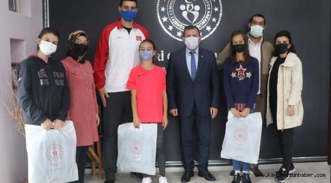 Vakıfbank Voleybol Alt Yapı takımına katılan Kayserili sporcular Yağmur Çavdar, Zeynep Alya İğret ve İkra Naz Yıldırım aileleri ve antrenörleri Kadir Aydın ile birlikte Gençlik ve Spor İl Müdürü Ali İhsan Kabakcı'yı ziyaret etti.