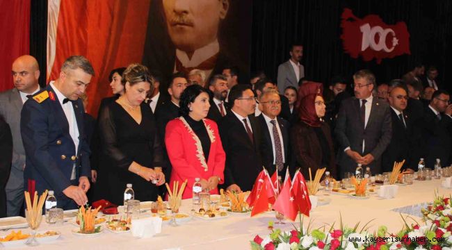Kentte bulunan bir balo salonunda düzenlenen Cumhuriyet Resepsiyonunda Vali Gökmen Çiçek, Garnizon Komutanı Tuğgeneral Haldun Taşan ve Büyükşehir Belediye Başkanı Memduh Büyükkılıç, protokol üyeleri ile davetlileri kabul etti. Saygı duruşunda bulunulması ve İstiklal Marşı'nın okunmasının ardından resepsiyonda konuşma yapan Kayseri Valisi Gökmen Çiçek, "İnsan hayatında çok önemli anlar vardır. Bu anlar hem yaşanılanlar hem de yaşandıkları yer itibariyle hayatımızda ömürlük anlamlar barındırırlar ve sonunda ölümsüz hatıralar olurlar. İşte bugün biz burada cumhuriyetin 100. yılının Milli Mücadele döneminde Anadolu'nun sigorta şehri olarak bilinen, Erciyes'in eteklerin olan bu muhteşem kentte hep beraber kutlamak hepimizin hayatında ölümsüz hatıra olacaktır. İnanıyorum ki cumhuriyetimiz daha nice yüzyıllarda birli, beraberlik içerisinde kutlanacaktır. Türkiye'nin yeni yüzyılına adım attığımız bugün her zamankinden daha çok çalışmalıyız. Bizim bu coğrafya da hür ve bağımsız olarak yaşamak istiyorsak; tembellik etmeye, üşenmeye hakkımız yoktur. Biz çalışmaya mecburuz. Çünkü bu coğrafya tembellik etmeyi kaldıramaz. Biz bu coğrafyada dik, hür ve bağımsız kalabilmek için hem tarihimizde ders alacağız hem de çok çalışacağız. Çünkü düşmanlarımız hala pusudadır. Bizler ecdadımızı onurlandırmak ve gelecekte çocuklarımıza yaşanabilir, güçlü ve büyük bir Türkiye bırakabilmek için çok çalışmalıyız" ifadelerini kullandı.