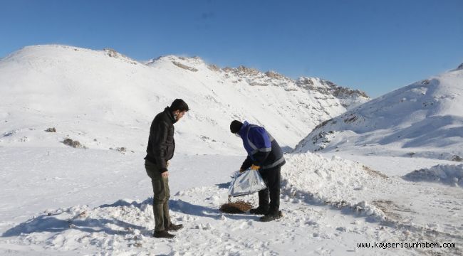 Kayseri'nin Yahyalı İlçesinde, belediye tarafından kış şartlarında yiyecek bulmakta sıkıntı yaşayan yaban hayvanları için yemleme çalışması yapıldı.