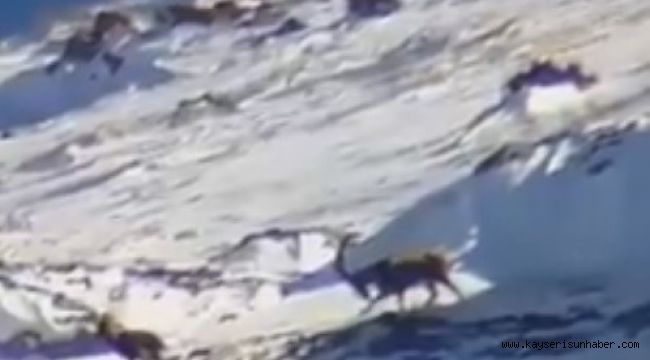 Vahşi yaşamda soyu tükenme tehlikesinde olan yaban keçisi sürüsü Kayseri'nin Yahyalı ilçesi sınırları içinde bulunan Aladağlar Milli Parkı'nda kameralara takıldı. Yoğun kar yağışının etkili olduğu bölgede yiyecek bulmak için alçak kesimlere kadar inen 10'a yakın yaban keçisi bölgedeki vatandaşlar tarafından görüntülendi.