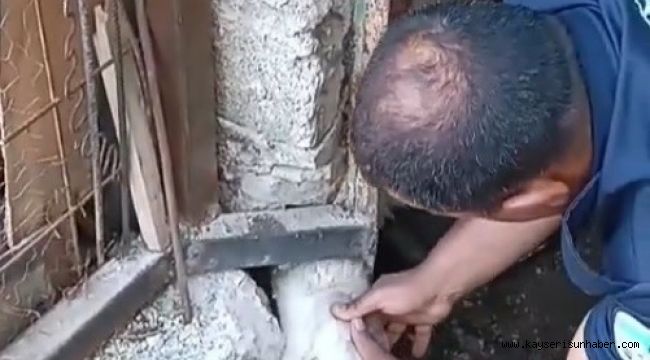 Kayseri'de kafası duvara sıkışan koyun, itfaiye ekiplerinin çalışması sonucu kurtarıldı.