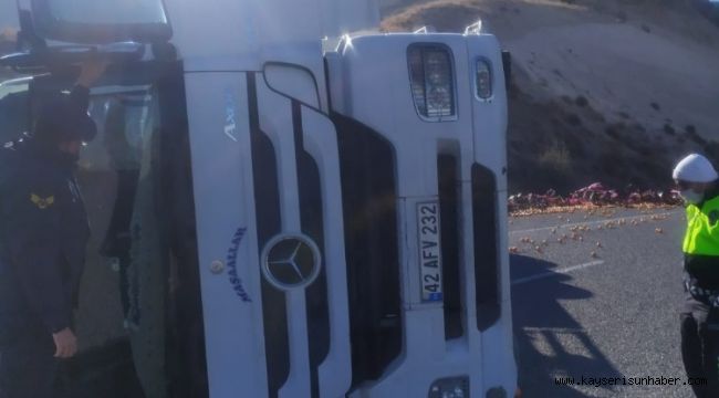 Yeşilhisar ilçesinde direksiyon hakimiyeti kaybolan kamyon yan yattı. Kazada, kamyonun dorsesinde bulunan tonlarca mandalina yola saçıldı.