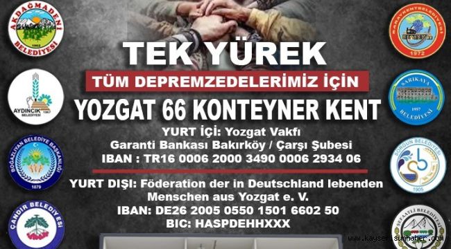 "Bilindiği üzere 6 Şubat Pazartesi sabahı saat 04:17'de merkez üstü Kahramanmaraş'ın Pazarcık ilçesinde 7.7, saat 13.24'te Elbistan ilçesinde 7.6 büyüklüğünde meydana gelen iki deprem, Kahramanmaraş başta olmak üzere 11 ilimizi etkilemiş ve büyük yıkıma neden olmuştur. Öncelikle enkaz altında kalan ahirete intikal eden bütün yurttaşlarımıza Allah'tan rahmet dileyerek rahmetle anıyor, geride kalan kederli ve gözü yaşlı ailelerimize Allah'tan sabır diliyoruz. Bizler; Almanya Yozgatlılar Federasyonu, Kayseri Yozgatlılar Federasyonu, İstanbul Yozgatlılar Federasyonu, Trakya Yozgatlılar Federasyonu, İstanbul'daki Anadolu Köy Dernekleri Federasyonu, Başkentteki Yozgatlı Dernekler Federasyonu, Yozgat Demokrat Dernekler Federasyonu, Almanya Bremen Yozgatlılar Derneği, Hollanda 66 Yozgatlılar Den Hagg Derneği, Avusturya Akdağmadeni Yardımlaşma Derneği ve Yozgat Vakfı olarak başlattığımız bu kampanyaya baştaYozgat Belediyesi, Akdağmadeni Belediyesi, Aydıncık Belediyesi, Boğazlıyan Belediyesi, Çandır Belediyesi, Çayıralan Belediyesi, Çekerek Belediyesi, Kadışehri Belediyesi, Saraykent Belediyesi, Sarıkaya Belediyesi, Sorgun Belediyesi, Şefaatli Belediyesi, Yeni Fakılı Belediyesi, Yerköy Belediyesi ve Çiğdemli Belediyesi'nin de destekleri olacaktır. Asrın felaketi olarak nitelendirilen bu zorlu süreçten hep birlikte çıkacağımızı şüphesiz biliyor ve bu süreçte depremzede kardeşlerimizin konaklayacağı bir yaşam merkezi oluşturmak için birlik ve beraberlik içinde 'Yozgat Konteyner Kent' kurarak yaraları bir nebze sarmak istiyoruz. Yozgat Konteyner Kent ile kampanya çalışmalarına başlamış bulunmaktayız. Yurtiçi bağışlarınız için Yozgat Vakfı hesabına yurtdışında yaşayanlar için de Almanya Yozgatlılar Federasyonu hesabına 'Konteyner' yazarak yardımda bulunabilir, kampanyamıza destek verebilirsiniz. Birlikten kuvvet doğar anlayışı ile hareket edip birazda olsa yüzlerde gülümsemeyi görmek istiyoruz. Bu felakette olduğu gibi aktif çalışan STK'larımızın bu mücadelede hızlı organize koordinasyon kurarak haberleşmede sosyal dayanışmada vücut bulmuş hali ve şekli modeli olduk. Düzenlemiş olduğumuz bu yardım kampanyası ile ilgili bağışlarınızı ilgili hesap numaralarına yapmanızı temenni ederken, rabbim ülkemize ve milletimize Bir daha böyle acı yaşatmamasını dua ile temenni ediyoruz."