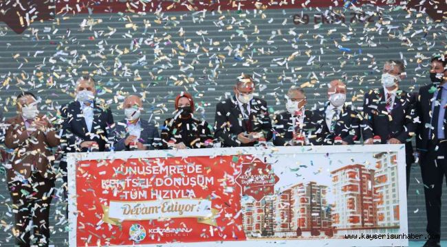 Belediye Başkanı Ahmet Çolakbayrakdar'ın ev sahipliğinde, Yunusemre Mahallesi'nde düzenlenen programa; AK Parti Genel Başkan Yardımcısı ve KAyseri Milletvekili Mehmet Özhaseki, AK Parti Kayseri Milletvekilleri Hülya Nergis Atçı ve İsmail Tamer, Büyükşehir Belediye Başkanı Memduh Büyükkılıç, AK Parti İl Başkanı Şaban Çopuroğlu, AK Parti Kocasinan İlçe Başkanı Hüseyin Okandan, kamu kurum ve kuruluşların temsilcileri, belediye meclis üyeleri, bölge sakinleri ve davetliler katıldı. Kocasinan Belediyesi olarak kentsel dönüşüm çalışmalarının hızlı bir şekilde devam ettiğini ve dönüşümle birlikte sosyal dönüşümü de aynı anda gerçekleştirdiklerini ifade eden Başkan Çolakbayrakdar, "Özellikle kentsel dönüşüm kanunu çıkartarak, belediyelerin işlerini kolaylaştıran Cumhurbaşkanımız Sayın Recep Tayyip Erdoğan'a teşekkür ediyor, şükranlarımı sunuyorum. Çıkarılmış olan kanunla birlikte daha hızlı bir şekilde dönüşüm projeleri gerçekleştiriyoruz. Kayseri'yi iyi tanıyan, ihtiyaçlarını iyi bilen birisi olarak yapılan bu çalışmaların her birinde Önceki Dönem Çevre ve Şehircilik Bakanımız Sayın Mehmet Özhaseki' nin destekleri ve katkıları var. Bundan dolayı Bakanımız Sayın Mehmet Özhaseki' ye teşekkür ediyorum. Kentsel dönüşüm kanunu bizim için bir fırsattır. Bu çerçevede hemşehrilerimin rızasını alarak, dönüşümü gerçekleştiriyoruz" diye konuştu. Kentsel dönüşüm projelerinin hayata geçirilmesinin sabır isteyen zor bir süreç olduğunu belirten Başkan Çolakbayrakdar, Kayseri'ye ve Kocasinan'a hizmet veren belediye başkanlarına teşekkür ederek, "Belediye başkanlarımızdan almış olduğumuz mirasın üstüne ekleyerek, bayrağı daha yukarılara taşıyıp, gelecek nesillere aktarmak için çalışıyoruz. Devam eden dönüşümle bu bölgede 6 blok halinde 336 dairemizin anahtarı ve tapusunu hak sahiplerine teslim ettik. Şimdi ise 6 bloktan oluşan ve her biri ikişer blok olan toplam 12 bloğun çalışmalarına başladık. Her bir blok 104 daireden oluşmaktadır. İlk etapta 227 tane imarsız yapıdan oluşan yaklaşık 500 hak sahibiyle tek tek yıllarca anlaşarak bugünlere geldik. Vatandaşlarımızın rızasını alarak, dönüşüm gerçekleştirdik. Geldiğimiz noktada hemşehrilerimizin memnuniyeti var. Birçoğunun söylediği; '40 yıldır beklediğimiz hayallerimizi gerçekleştirdiniz' yorumları var. Dönüşümle birlikte sosyal dönüşüm gerçekleştirdik. Buraya çevre düzenlemenin yanı sıra büyük bir park ve Kocasinan Akademi'nin havuzlu sosyal tesisini yapacağız. Diğer mahallelerimizde devam eden dönüşümle bölgenin ihtiyaçlarını teker teker çözüp, hayata geçiriyoruz. Dönüşümle birlikte geleceğimizin teminatı evlatlarımız, yeni ve konforlu bir şehirde yaşayabileceği alanları sunacağız. Gayretimiz, çocuklarımıza, daha güzel bir gelecek sağlayabilmek içindir" ifadelerine yer verdi. Başkan Çolakbayrakdar, Kayseri'ye daha iyi bir şekilde hizmet edebilmenin gayreti içinde olduklarını belirterek, "Biz, şehrimizi ve vatandaşlarımızı seviyoruz. Bu şehre sevdalı ve bu milleti seven ekip ruhuyla çalışmalarımıza devam edeceğiz." diyerek noktaladı.